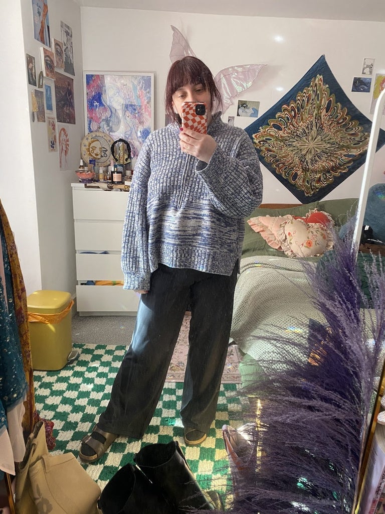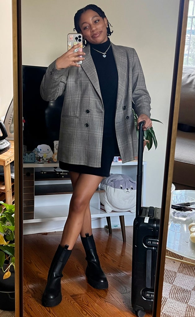 “First, a well-fitting but slightly oversized blazer is a must — it’s easy to take off at security and a posh, versatile layer to have on the go. I will always vouch for Mango’s blazers. I can’t find my specific go-to on the web but for good reason: I bought this a solid five years ago (and it still feels good as new). Here is a similar blazer from Mango.