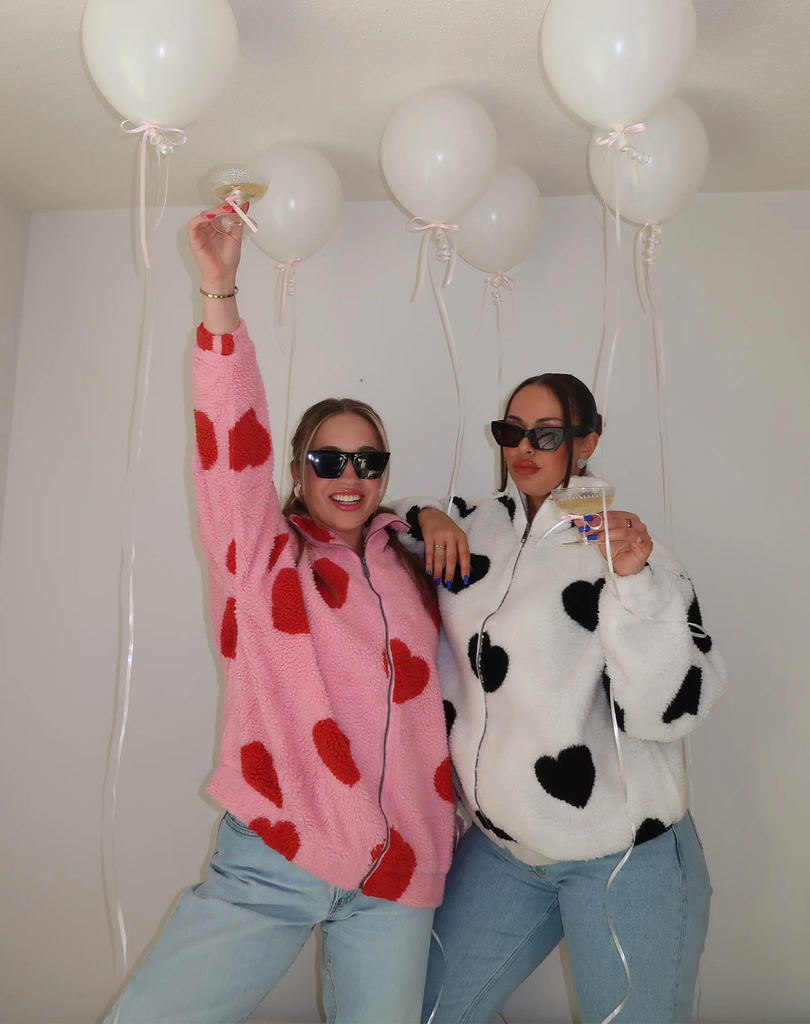 BRUNETTE The Label The “ALL OVER HEART” Sherpa Jacket | Baby Pink & Red, $159