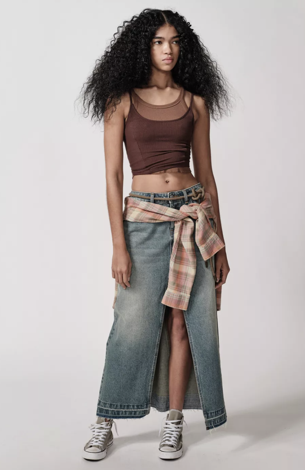 This style is for anyone looking to channel their teenage angst or simply peruse a farmer’s market on a lazy Sunday afternoon. The faded wash and pre-frayed hem give this skirt a lived-in, casual feel. But the a-line silhouette and center slit to make it not so basic.