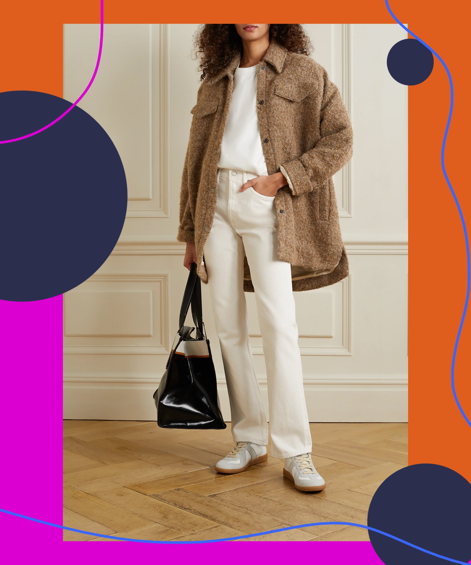 “We are seeing winter whites trending this season — combining mixed textures in shades of whites, creams, and neutrals is an easy way to achieve an elevated look. If you are going for something casual, think white denim jeans, neutral chunky Chelsea boots, a simple white turtleneck, paired with a sleeveless white puffer jacket. Accent with tan accessories, such as a crossbody bag and leather belt, to complete the look.” — Libby Page, Net-A-Porter Senior Market Editor