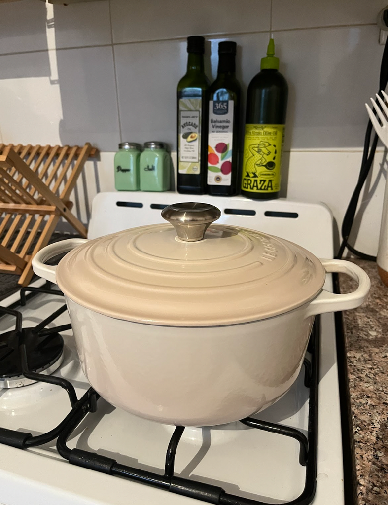 “My family gifted me a Dutch oven for Christmas because I’ve been cooking up so many stews, soups, and warm-season dishes. At first, I thought my studio kitchen couldn’t handle a hefty piece of cookware like this, but soon realized after three years in this apartment it was time to invest in my cookware and…myself. I’ve used it so much since receiving it, I regret putting it away in the cabinet everytime, and just keep it on my stove. It’s a pretty ‘meringue’ color too, so it goes well with my off-white cabinetry and white stove. It’s such a kind gift, and one of those pieces I know I’ll use from house to house forever.”—Clare Palo, Senior Strategist, Audience Development