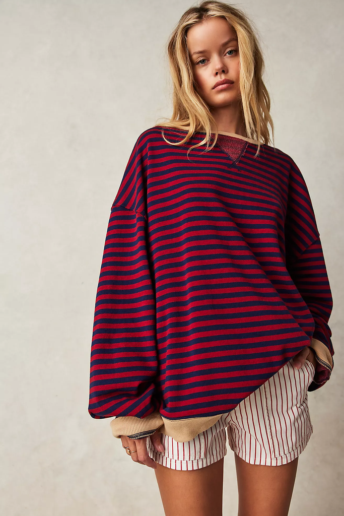 “This oversized striped long-sleeve just looks and feels so nostalgic to me — almost like something I’d find in a vintage store or in the back of my dad’s closet. I’d wear this to lounge around my apartment, with white denim for a casual coffee run, or thrown over workout clothes for an extra layer.” — Kate Spencer, Sr. Affiliate Partnerships Manager