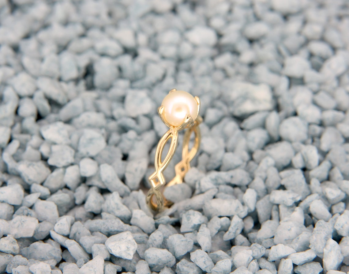 AverieJewelry 14K Gold Celtic Pearl Engagement Ring, $, available at Etsy