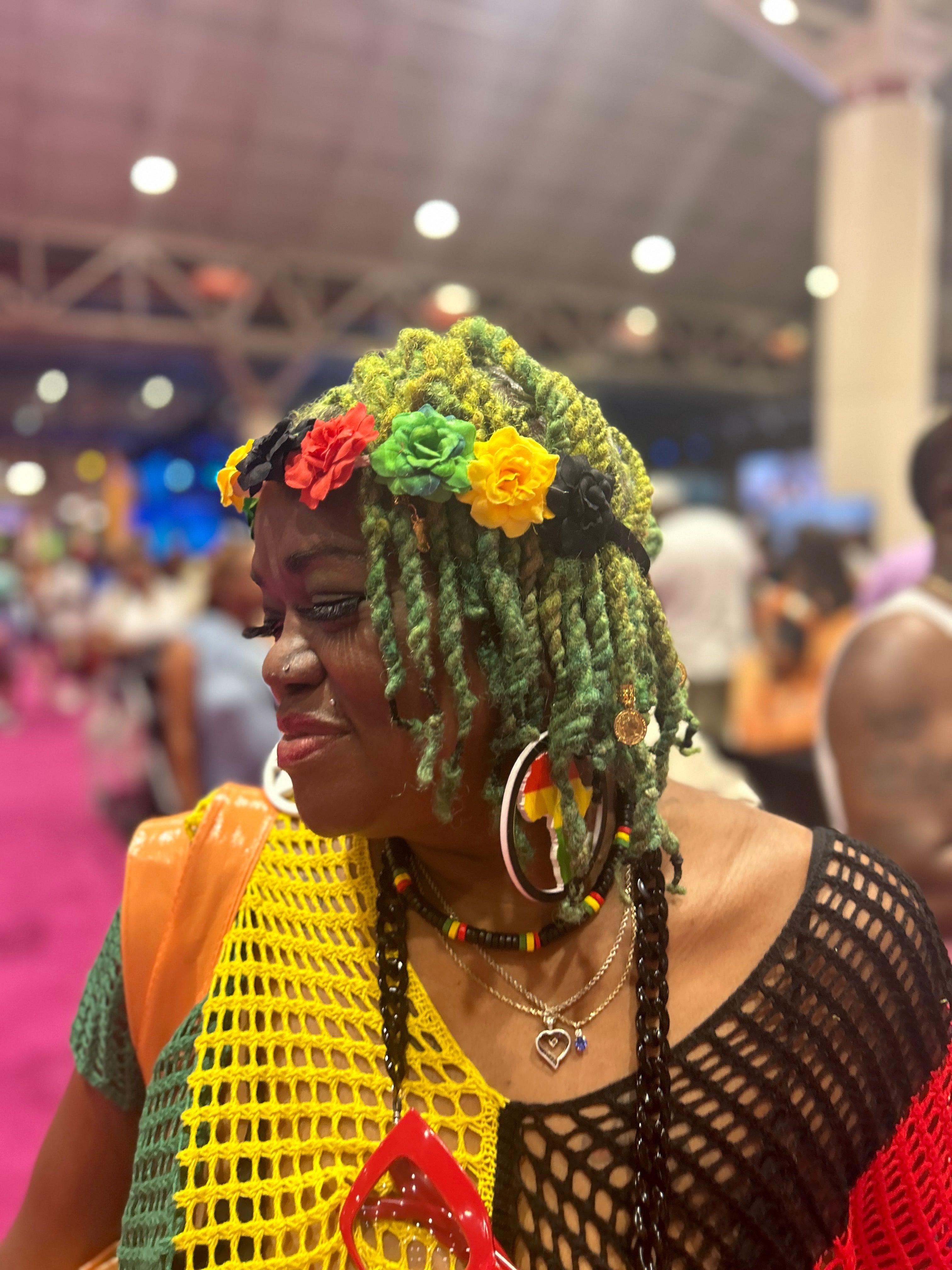 Dollie Michelle of Philadelphia, P.A. was one of many fashion standouts as she rocked bantu knots paired with a shirt from her brand, Cocoa Canvas, during ESSENCE Festival. The podcast host told Unbothered that she is grateful for the opportunity to showcase her brand while also being “immersed in Black culture and Black joy.”