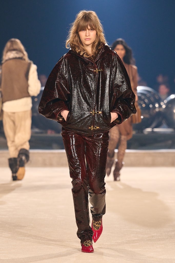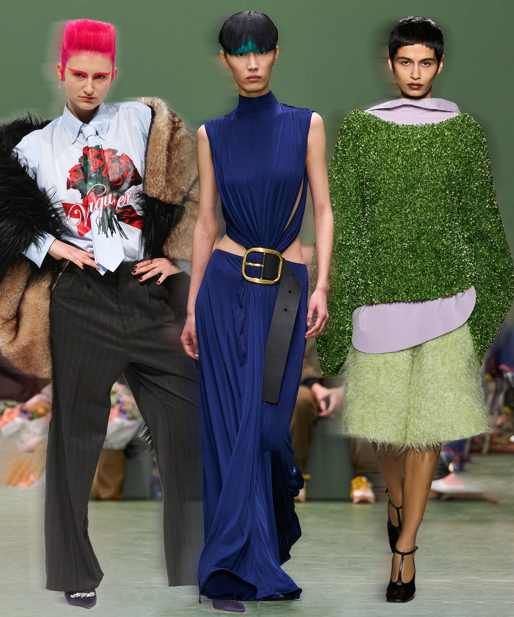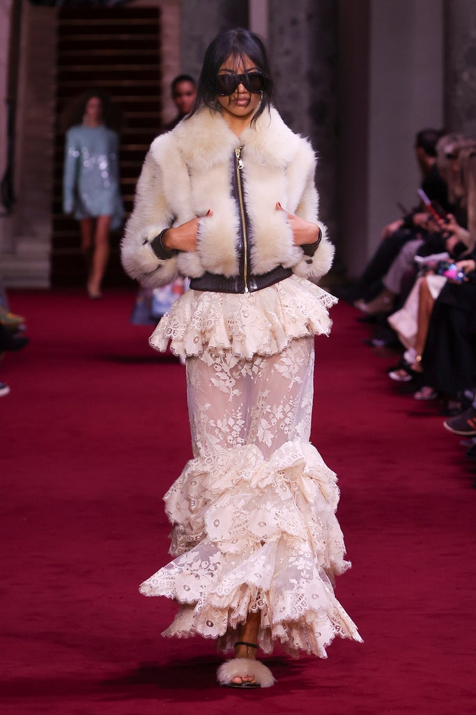 As expected for the cold-weather season, furry coats and fur-embellished outerwear were everywhere on the runways, with the highlight being neon green-accented pieces that appeared during the Off-White show and the Mob Wife-esque looks worn by Gigi Hadid and Amelia Gray on the Miu Miu runway. More unexpectedly, furry shoes and bags provided a touch of interest to the standard winter offerings, as seen at Acne, Dries Van Noten, and Saint Laurent where fuzzy bags complemented the looks, as well as Zimmermann where, in addition to stuffed animal-like totes, fur-adorned sandals provided an alternative twist on the footwear trend.