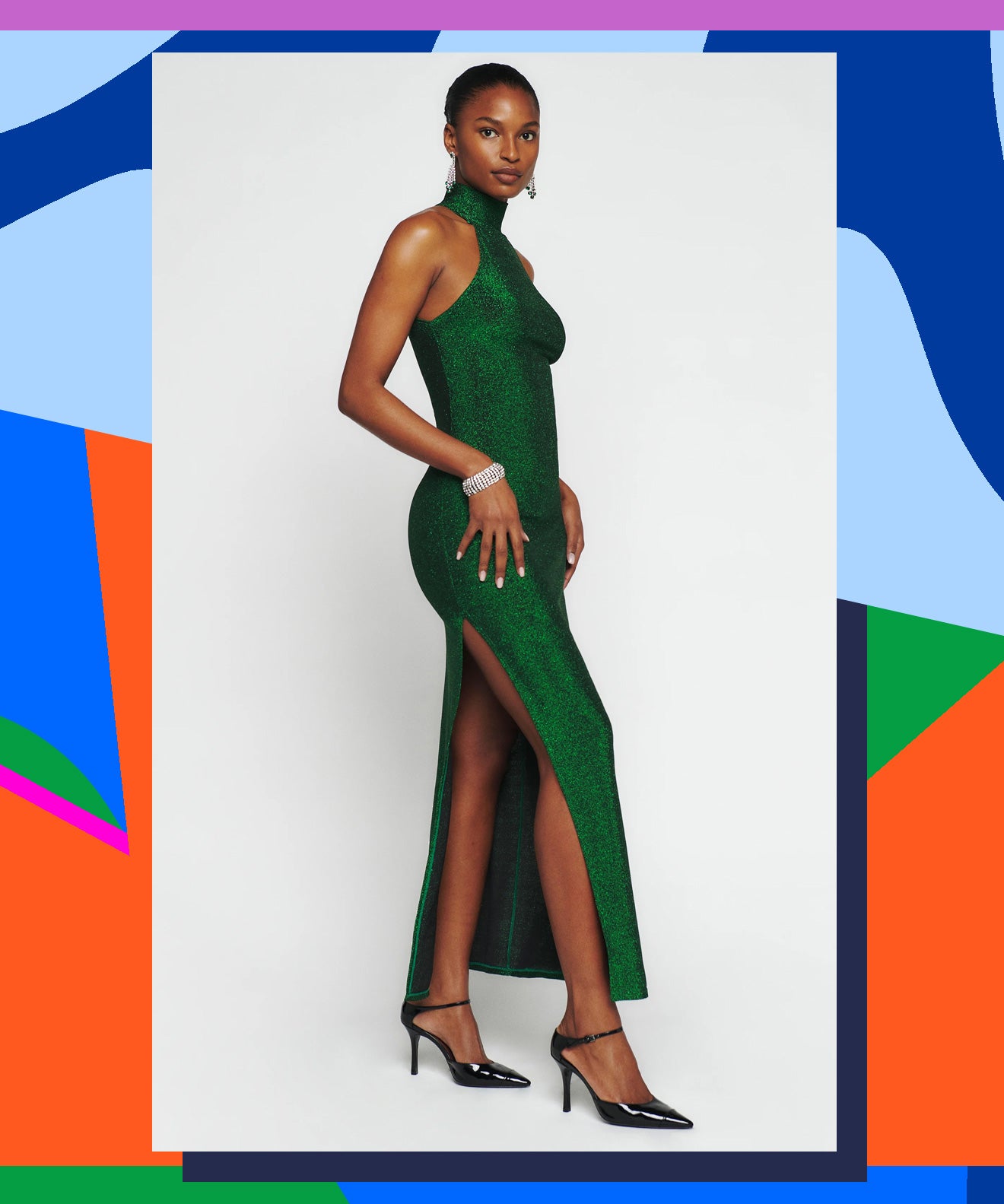 It’s probably a rule that you ought to wear some kind of emerald green this holiday season. So why not go all out with a shimmering figure-hugging dress with a thigh-high slit?