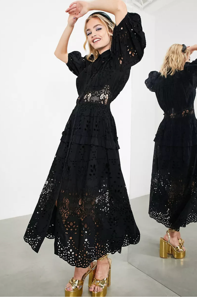 Asos Edition Waisted Broderie Midi Shirt Dress With Puff Sleeve In Black, $190