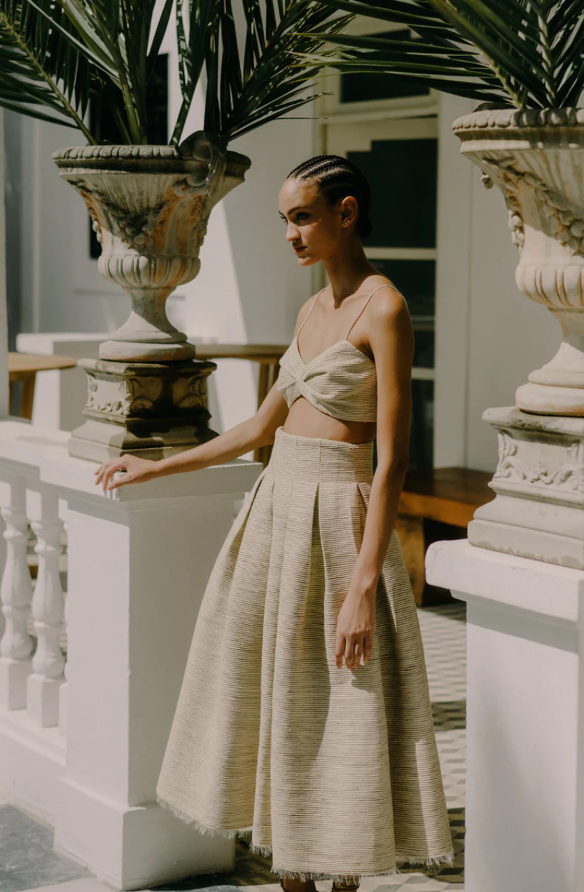 Based in the Dominican Republic, Vásquez adds a minimalist aesthetic to Caribbean design, with pieces ranging from two-piece midi skirt sets to swimwear and fringe cover-ups.