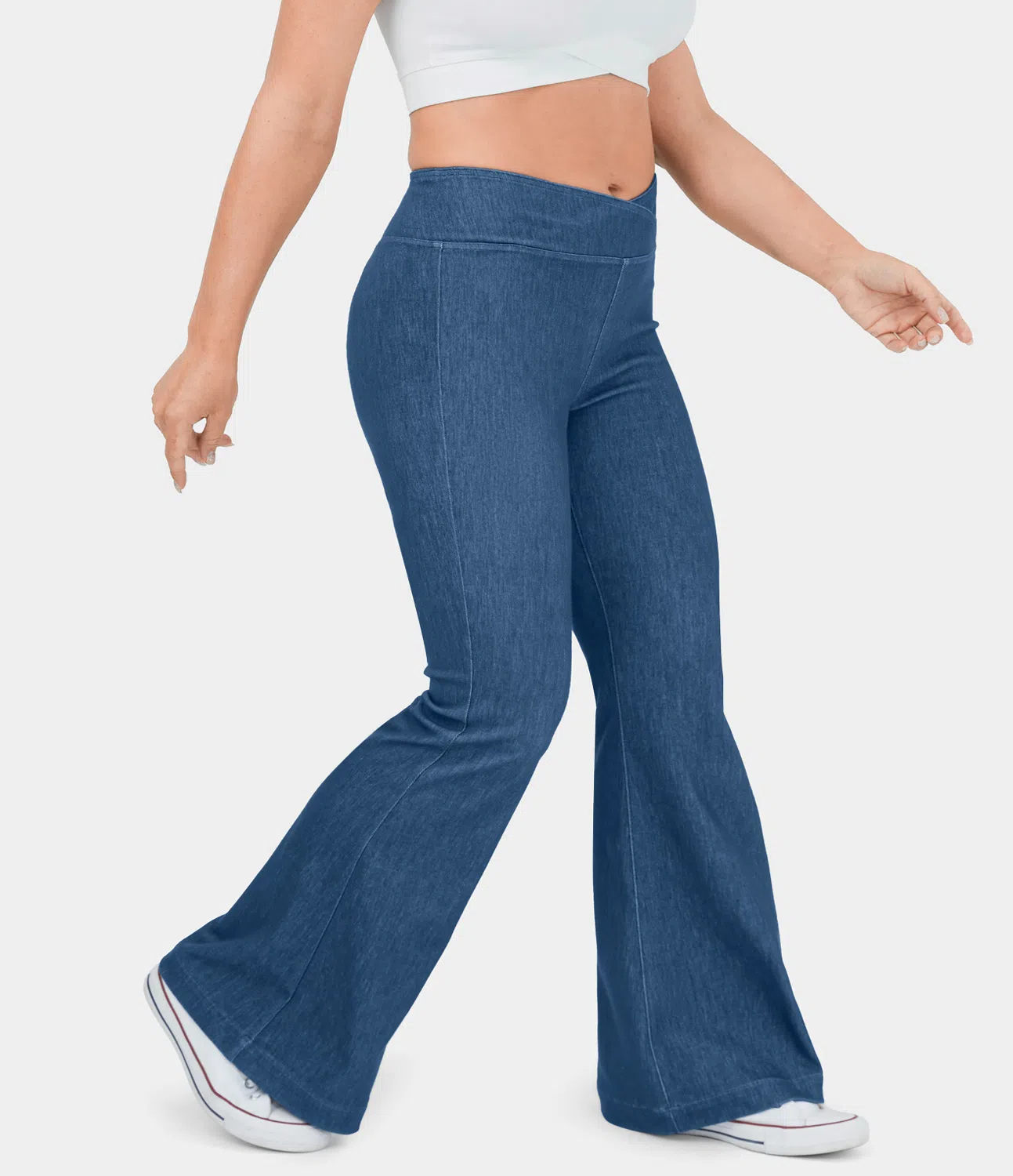 Halara High Waisted Crossover Stretchy Knit Denim Flare Pants