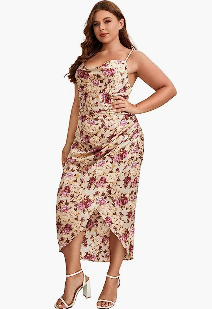 Floerns Plus Size Satin Spaghetti Strap Cowl Neck Wrap Dress, $, available at Amazon