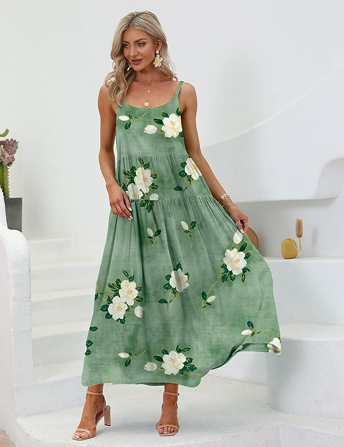 This tiered maxi ankle-length dress has an A-line silhouette for a relaxed, flowy fit. Don the floral style for summer birthdays, bridal showers, tropical vacations, and more.