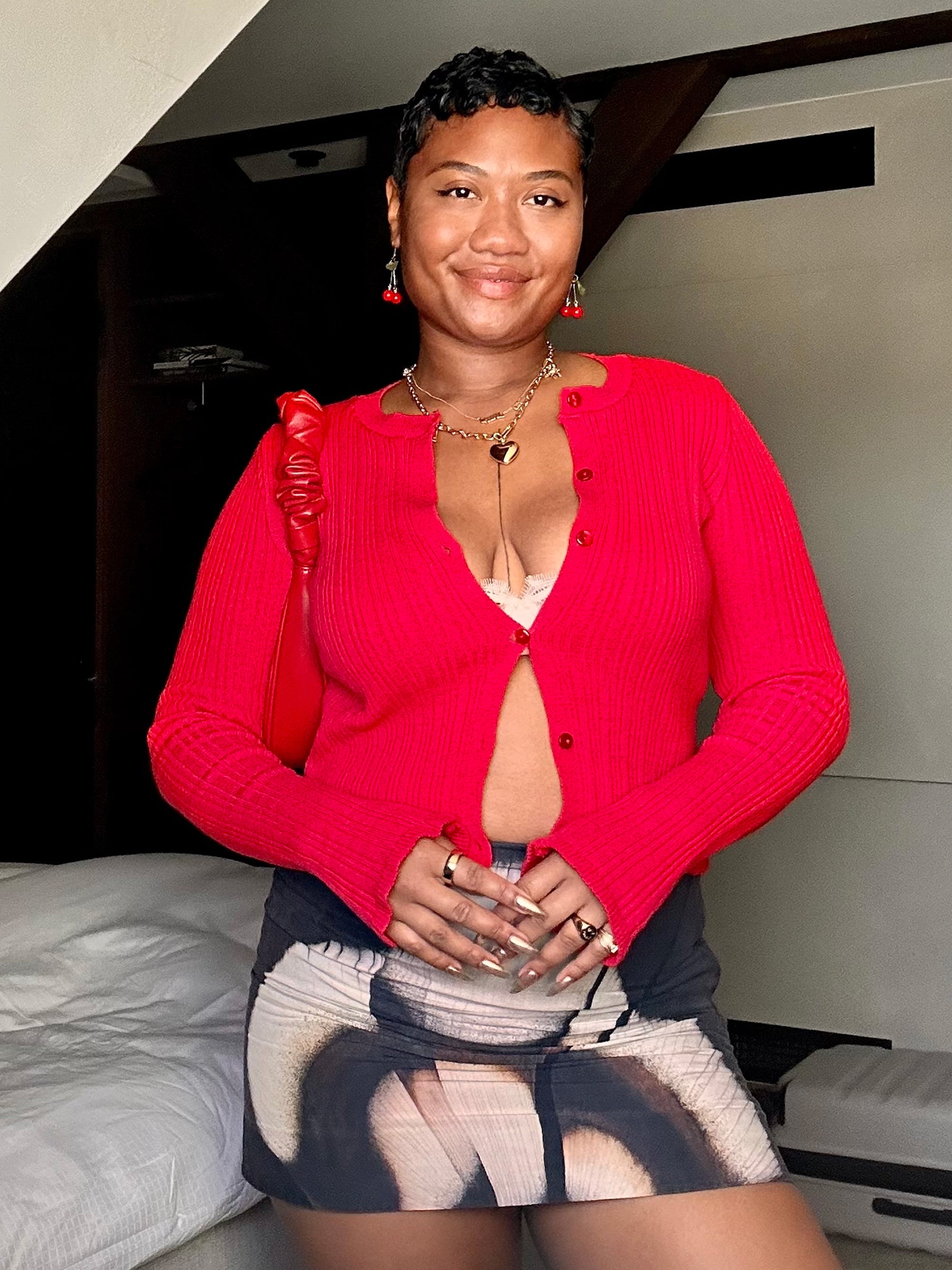 “Cardigans are sexy again and they’re the perfect summer-to-fall layer. This red cardigan is equal parts coquette and grandma-core, thanks to the slinky fit and frilly knit. Aside from this pairing with my Cos mini skirt, I have also styled it with baggy jeans and yoga pants, and on top of tank tops and bodysuits. I love its versatility and that I can easily pack it into a tote bag or purse for cooler nights. Oh, and cardigans were a major trend on Copenhagen Fashion Week runways, too.” — Ebony-Renee Baker, Fashion Editor