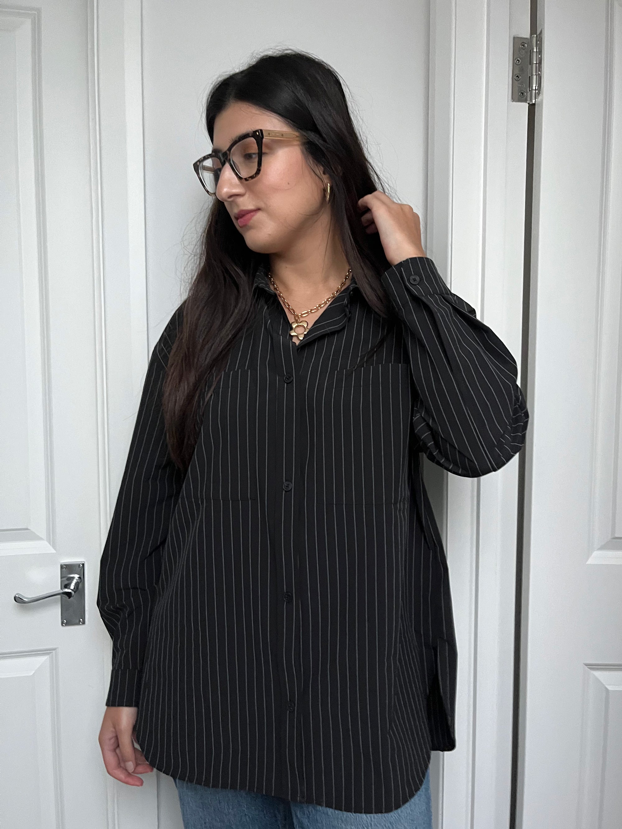 Alo Yoga Pinstripe Daylight Button Down Long Sleeve, $, available at Alo YogaPhoto Courtesy of Tanyel Mustafa.