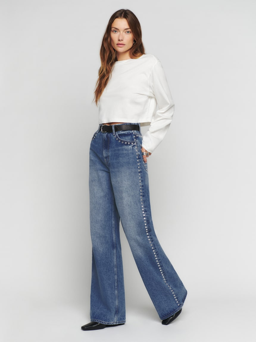 Whether cropped or floor-length, a classic pair of wide-leg jeans can do wonders for your wardrobe. Style the versatile denim staple with a crop top and slingback heels in the summer, or a cardigan and chunky clogs in the fall. Scroll on to find slim trouser-like cuts, along with ultra-wide ankle-length jeans, with fun details like studs, statement stitching, and pleats.