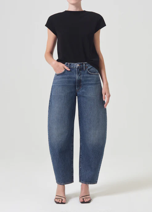Barrel-leg jeans have spiked in popularity recently, thanks to their sculptural shape, surprisingly flattering fit and easy-to-get availability, now that so many retailers are selling such a divisive style. Also called horseshoe jeans or balloon jeans, they curve out at the knee (wider than your hips) for extra room, and taper in at the ankle. Look through our top picks, which feature darted seams and statement stitching.