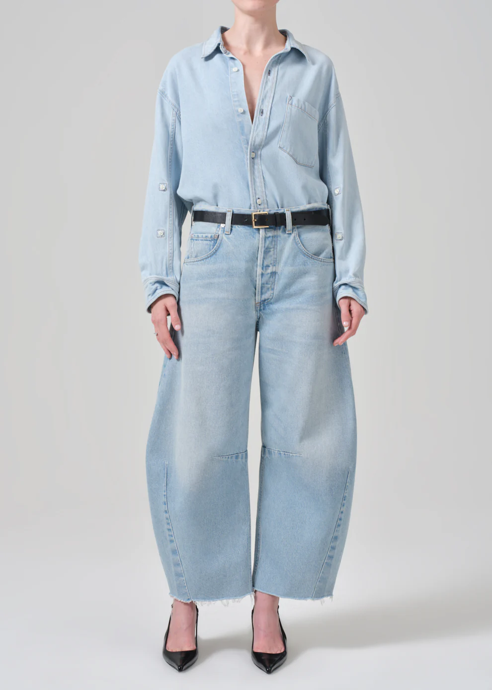If you’re looking for super-casual and comfortable denim, there are plenty of wide-leg jeans that are slouchier, baggier, and more relaxed. Find billowy styles that are cropped and ones that pool at the floor or require you to cuff them, including those with extra width around the knees, like the iconic Citizens of Humanity horseshoe jeans. So for your wide-leg denim dreams, consider all the baggy jeans out there.