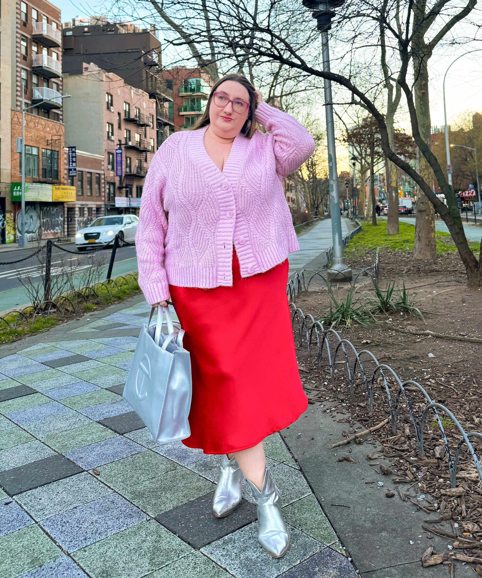 The dress is sexy (with slits on both sides) and date night-ready on its own, but you can easily dress it down with a chunky cardigan like this baby pink cable knit. I took inspiration from the lurex thread in the knit and accessorized the look with silver boots and my beloved Telfar bag. The pale pink looks great with the bold red of the slip, and I love the unexpected pairing of silver with this otherwise classic Valentine’s Day color palette.