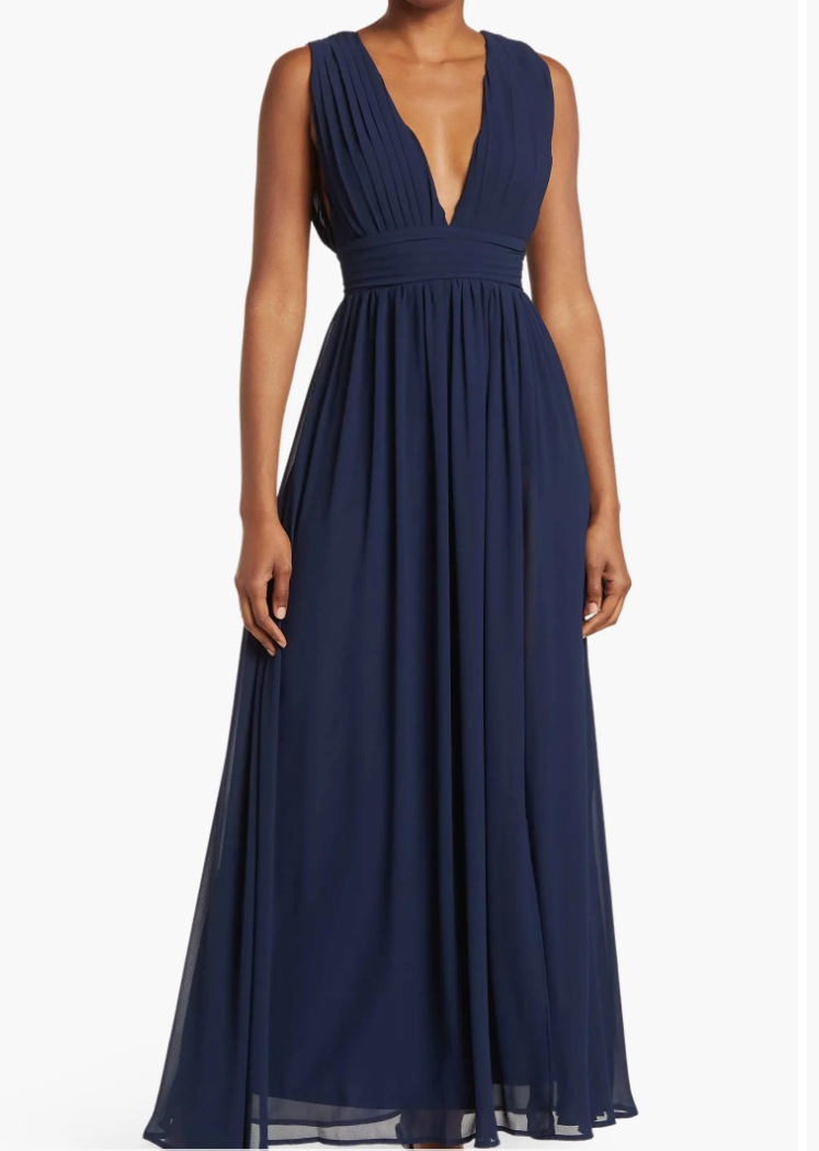 Mac Duggal Chiffon Plunge Neck Gown, $, available at Bloomingdale’s