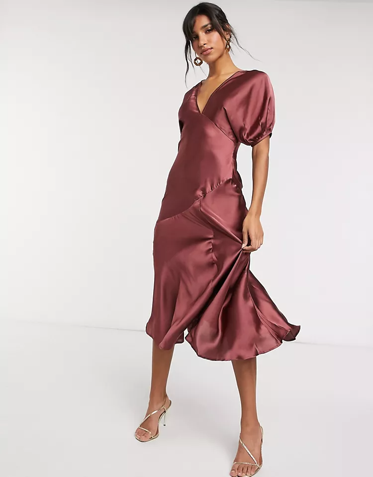 ASOS DESIGN puff sleeve satin tea dress, $, available at ASOS