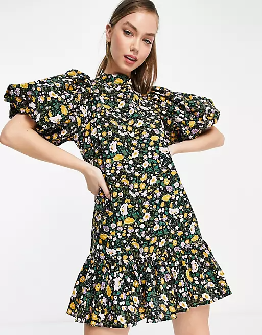 Ghospell Figurative floral puff sleeve mini dress, $, available at ASOS