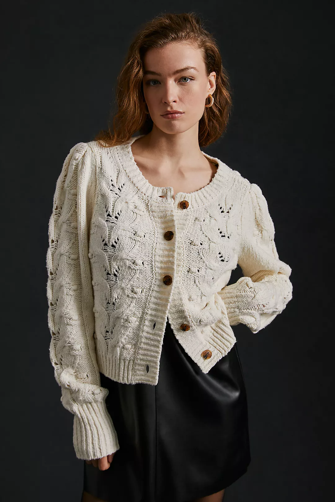 Maeve Cable-Knit Puff-Sleeve Cardigan, $128