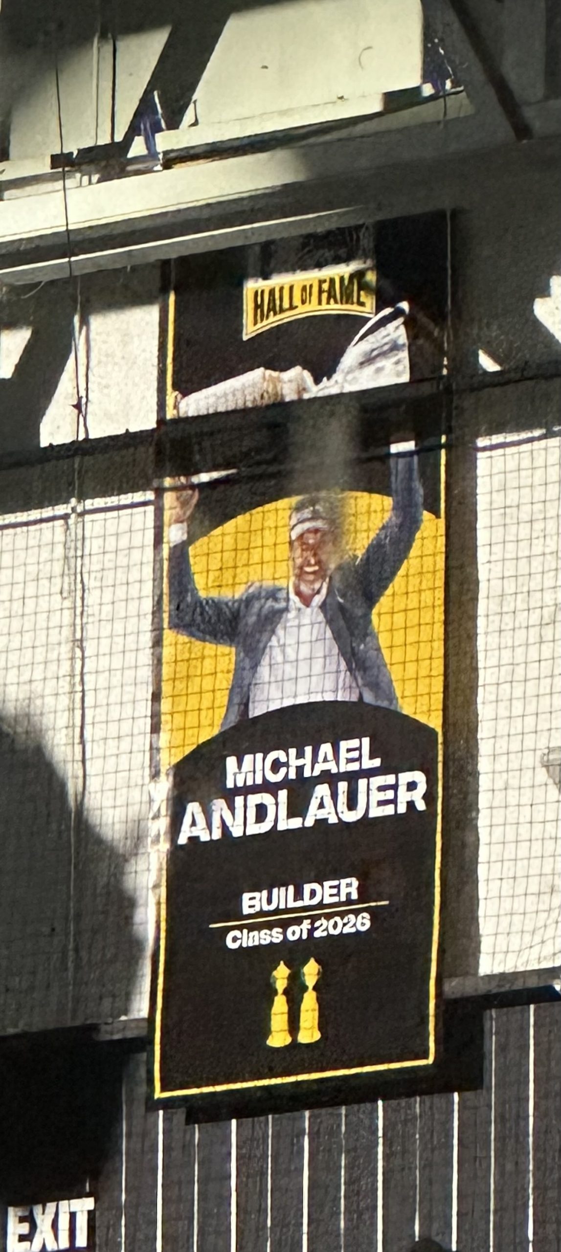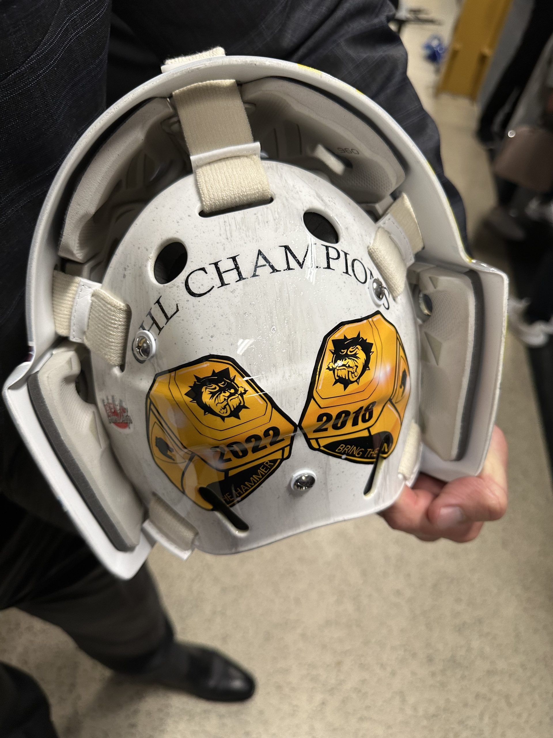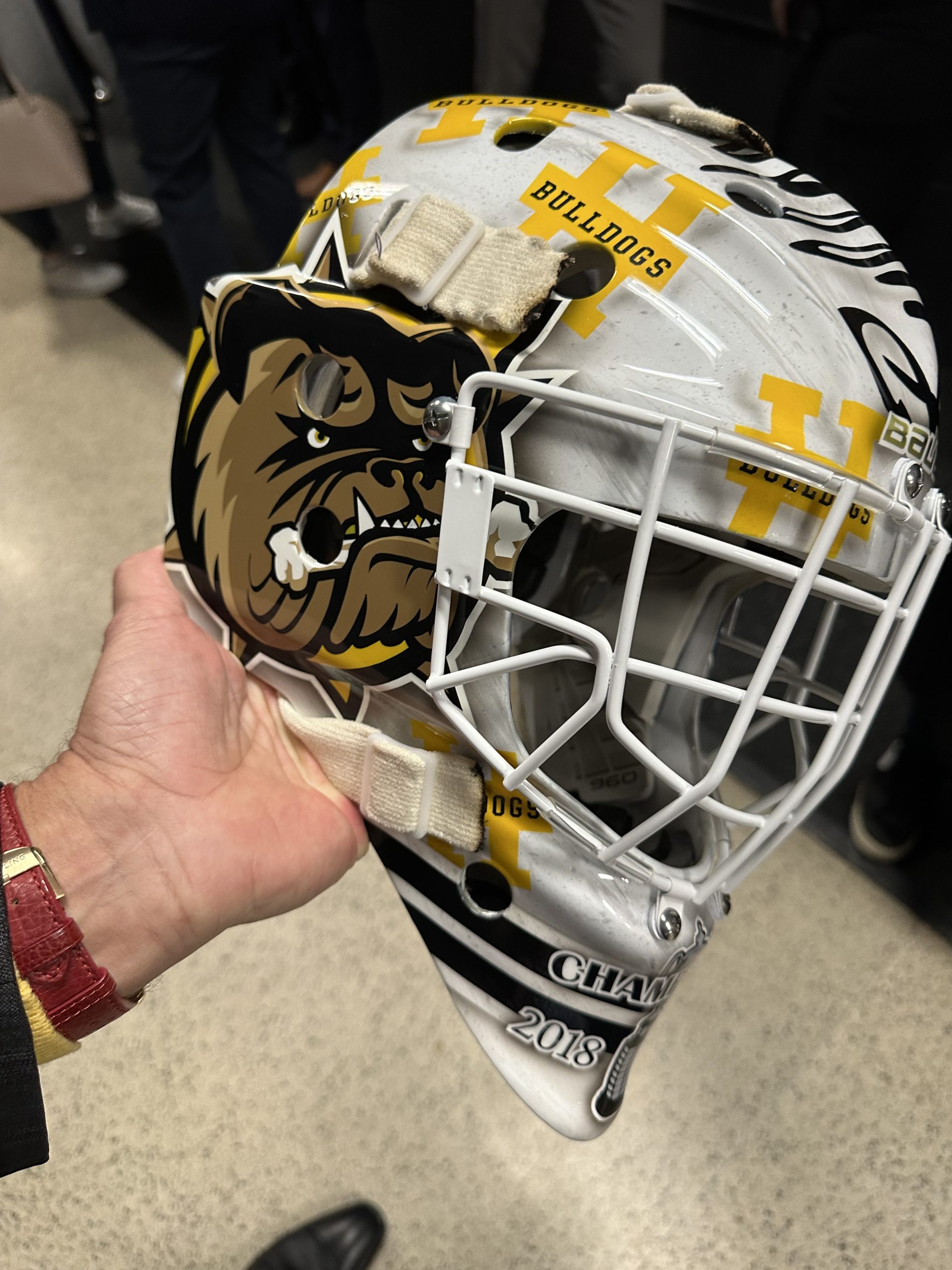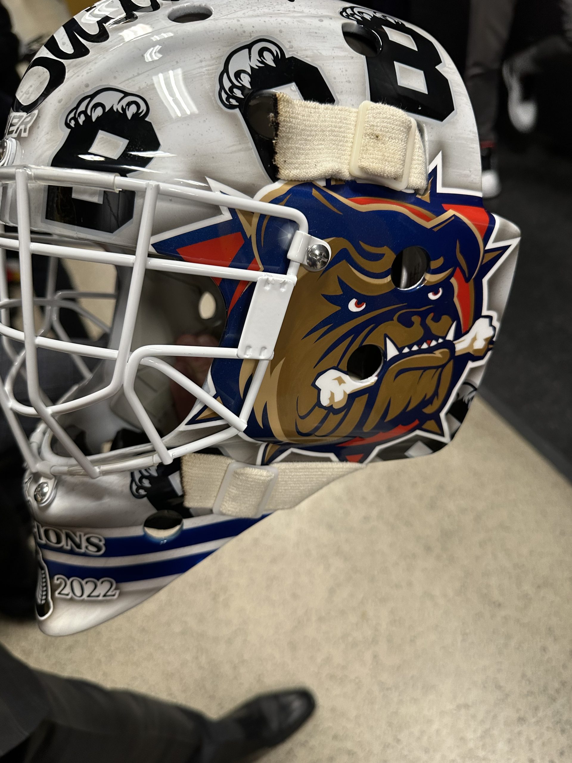 30. Excellent ceremony on Feb. 27 by the Brampton Bulldogs, honouring Michael Andlauer, who sold the team to the Hyman family in 2025. In addition to the banner, Andlauer was given a custom goalie mask (3 PHOTOS) featuring the current logo, the previous logo (when the franchise was in Hamilton) and championship rings from their 2016 and 2022 OHL championships.