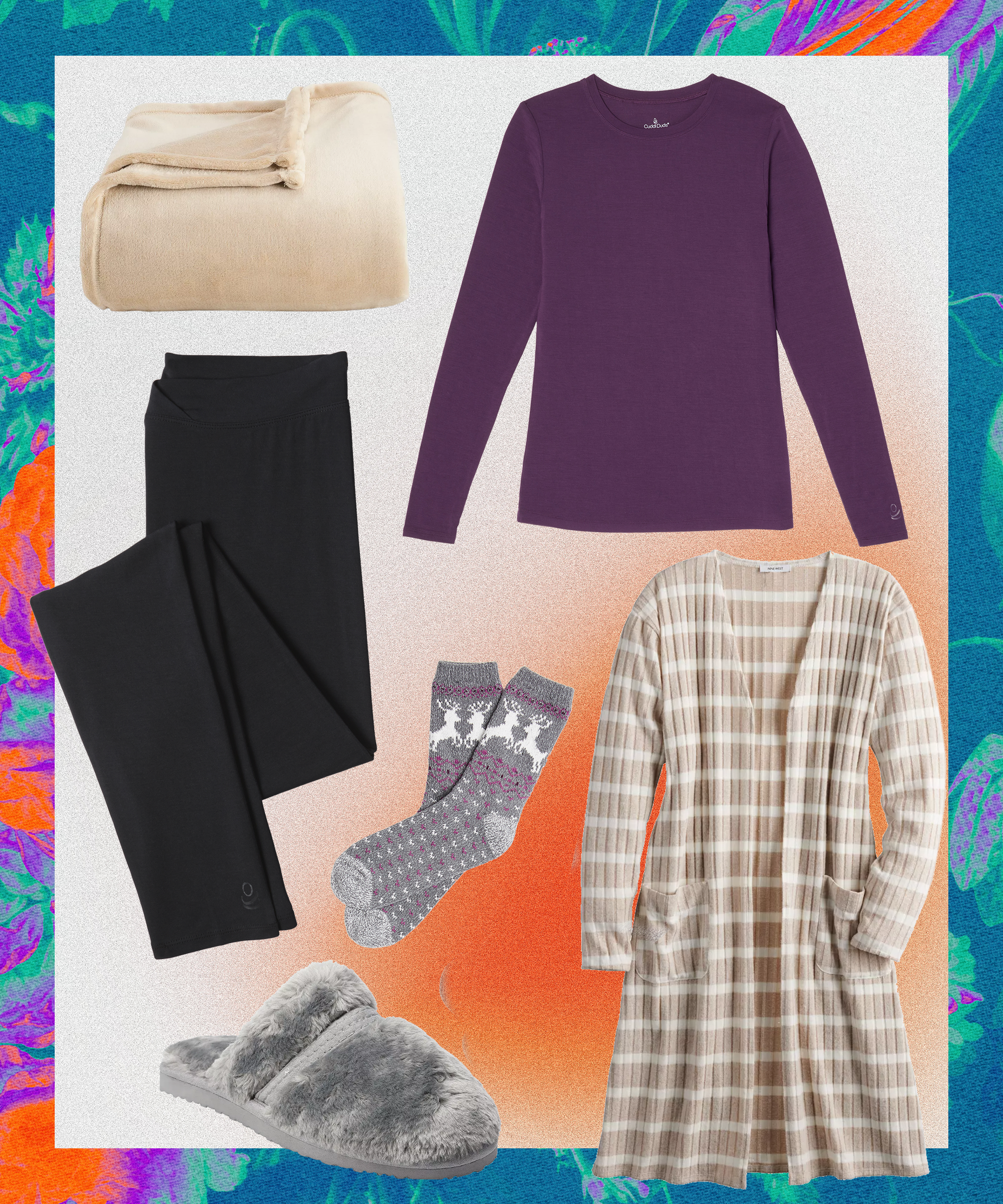 Okay, we know we said this was all about leaving your house, but we want to make this transition easy, which is why this look featuring the Cuddl Duds Softwear with Stretch crew and leggings is a fine place to begin. Layer a striped longline cardigan on top of these base layers and accessorize with seasonal socks and slippers for an outfit that feels appropriate for, say, an English countryside cottage.