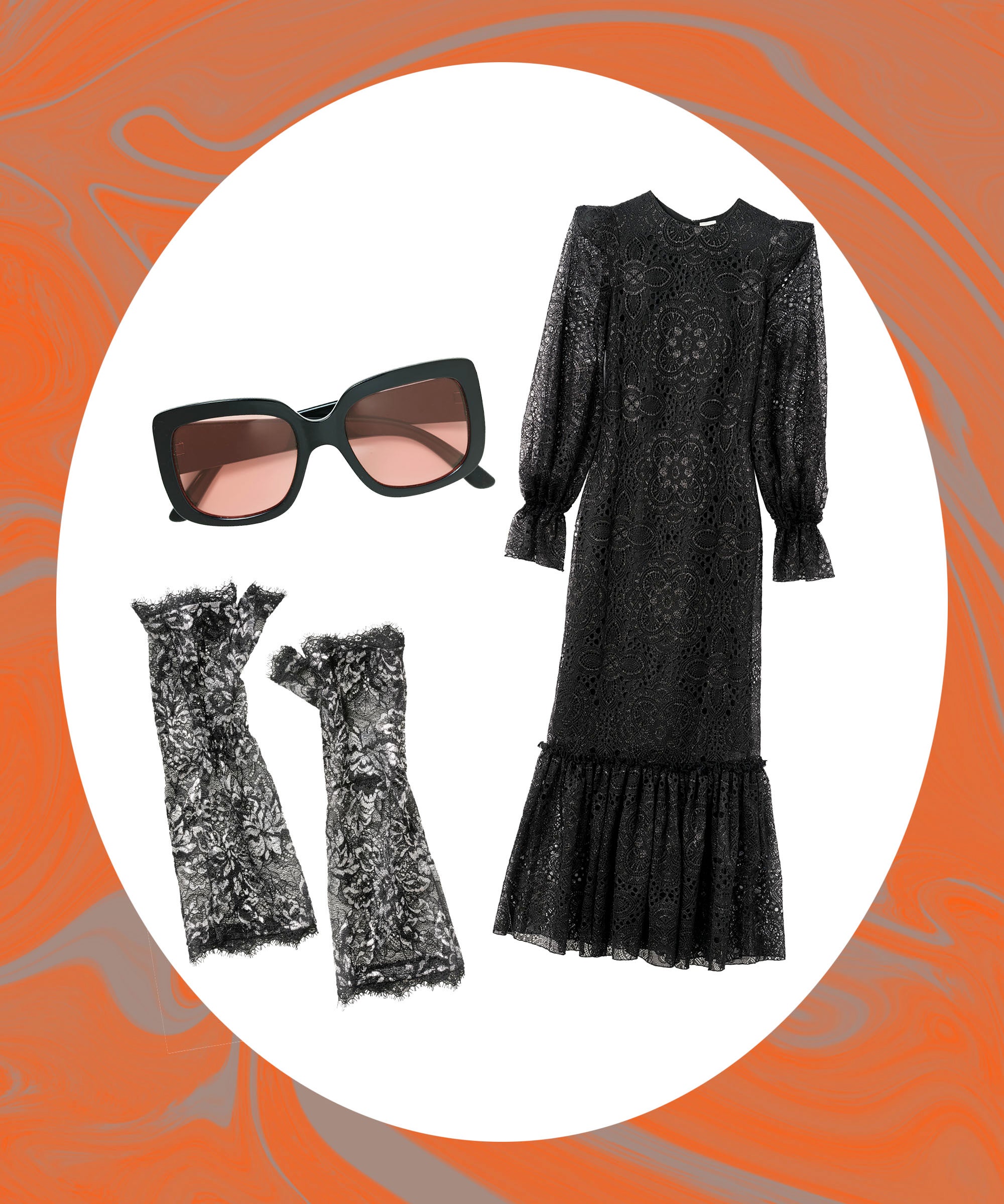 Together, a floor-sweeping openwork gown, fingerless lace gloves, and rich-widow sunglasses inspire shock and awe — and convey a thematically appropriate witchy spirit, pitch-perfect on the spookiest night of the year, if you’re so inclined.