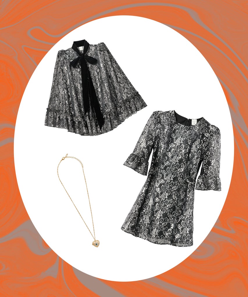 What to wear, if you, like this editor, are celebrating another turn around the sun soon? Our answer: “creative black tie,” with a matching minidress and bow-closure cape in shimmery lace, and a charm to ward off the evil eye.