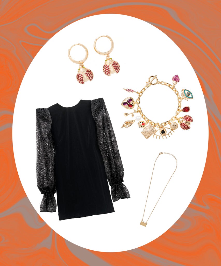 For feeling your own power with an added dose of good luck, we’ve paired a sharp-shouldered dress and heaps of amulets, including nazars, ladybugs, and a miniature envelope for holding love letters, affirmations, etc.