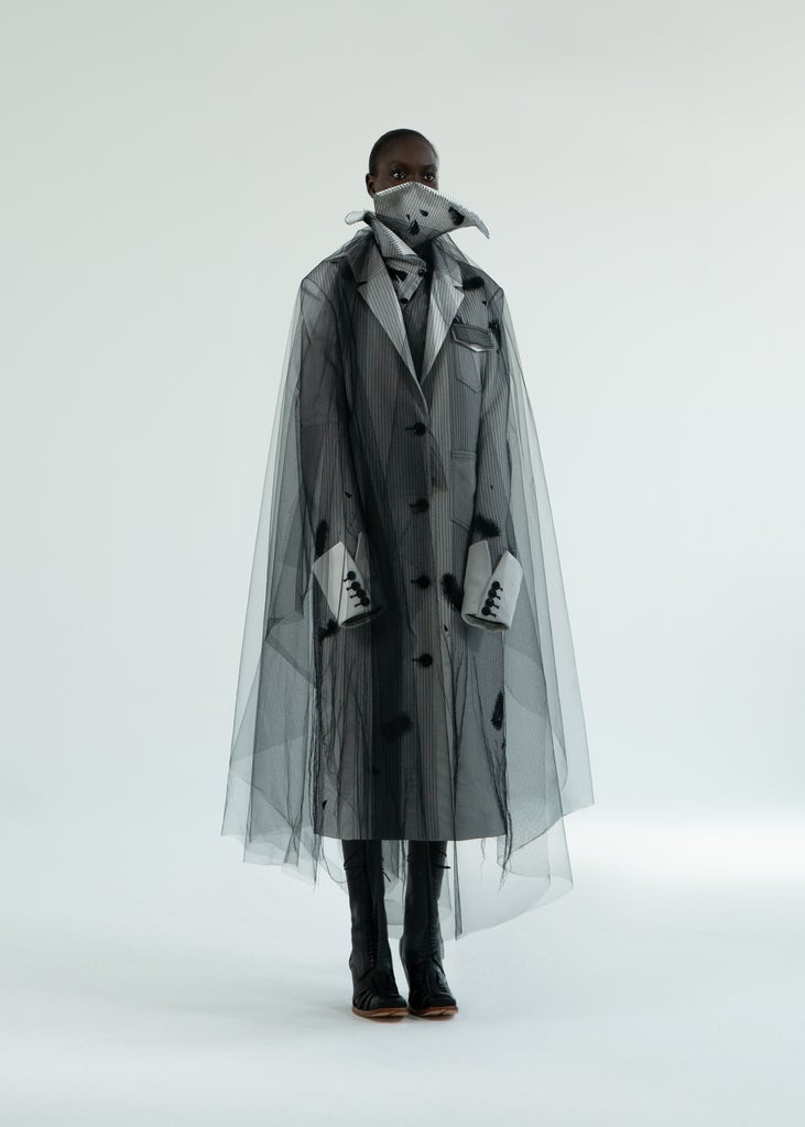 Launched by Parsons graduates Lu Chen and Jacky Luo, Lùchen debuted its first collection during the spring 2022 season, showcasing a lineup of deconstructed minimalism and ethereal whimsy. Take, for example, a tulle cape, worn on top of a structured menswear-inspired coat. Or: the gravity-defying tops that spring up like coral reefs in the ocean. It’s precisely this mix of softness and razor-sharp tailoring that made Chloe King, Amazon’s Brand Relations Lead, stop scrolling when she first saw the brand on Instagram. “I was blown away by the imagery of their first collection — sophisticated, artful, and surreal,” she says. “I always love a Schiaparelli reference.”