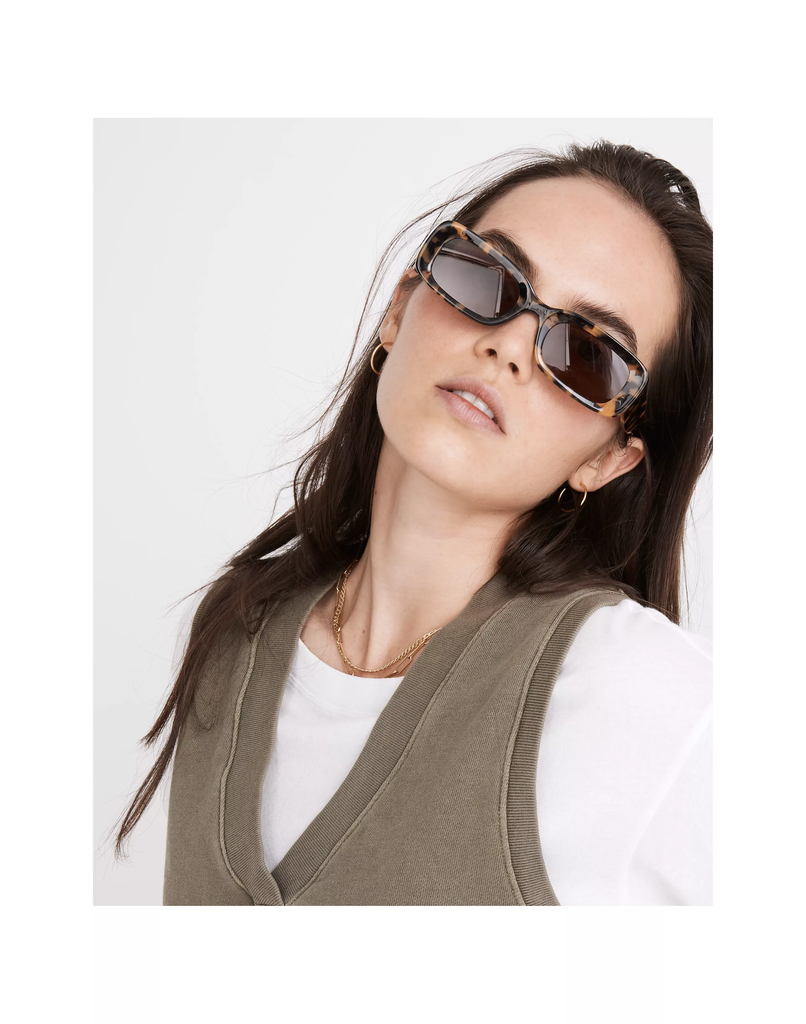 The rectangular frame is this season’s version of the super skinny sunny. It’s more versatile than a tiny lens as a rectangular frame can be worn just as easily with your casual errands ‘fit as with your next wedding guest dress. And if you’re still lusting after that narrow look, just opt for a skinnier frame.