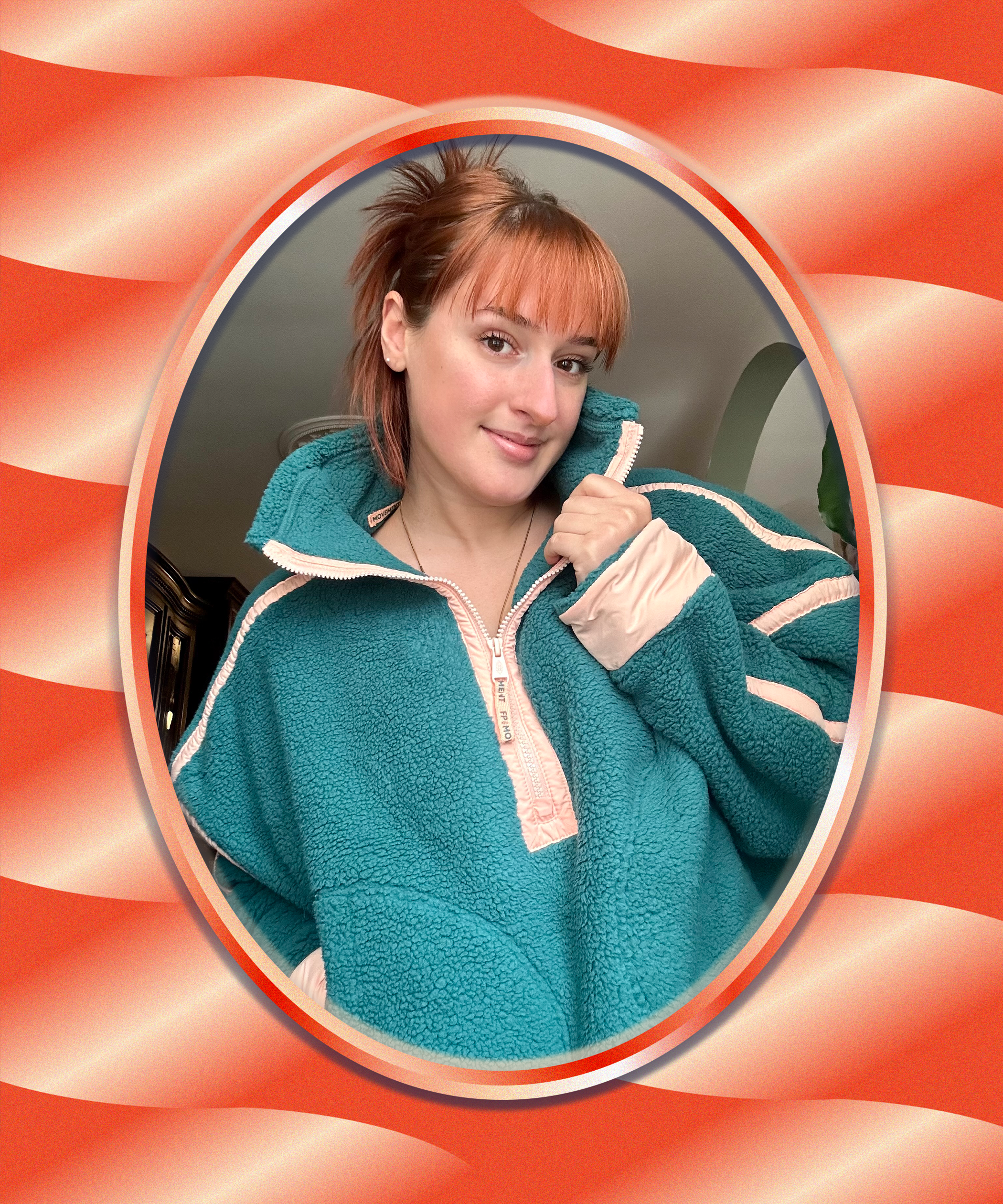 “First off, this color combo is outrageous in the best possible way. I love the unique deep teal green and contrasting soft salmon pink, especially because it isn’t like anything else I own — but it will still easily pair with any of my jeans. The fleece is sooo supremely soft inside and out, as is the ‘puffy’ trim. I usually am between a medium and a large, but I ordered this piece in a size large for extra cozy-comfy vibes. I find it to be very oversized, especially with the dramatic zip-up neckline, so I could have definitely sized down, but I’m not upset about it, especially since I can cinch the waist with the drawcord.” —Victoria Montalti, Associate Affiliate Writer