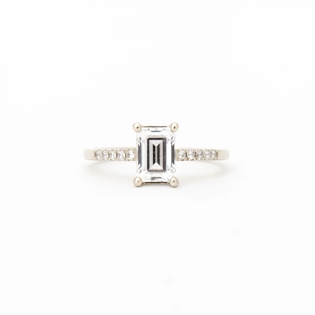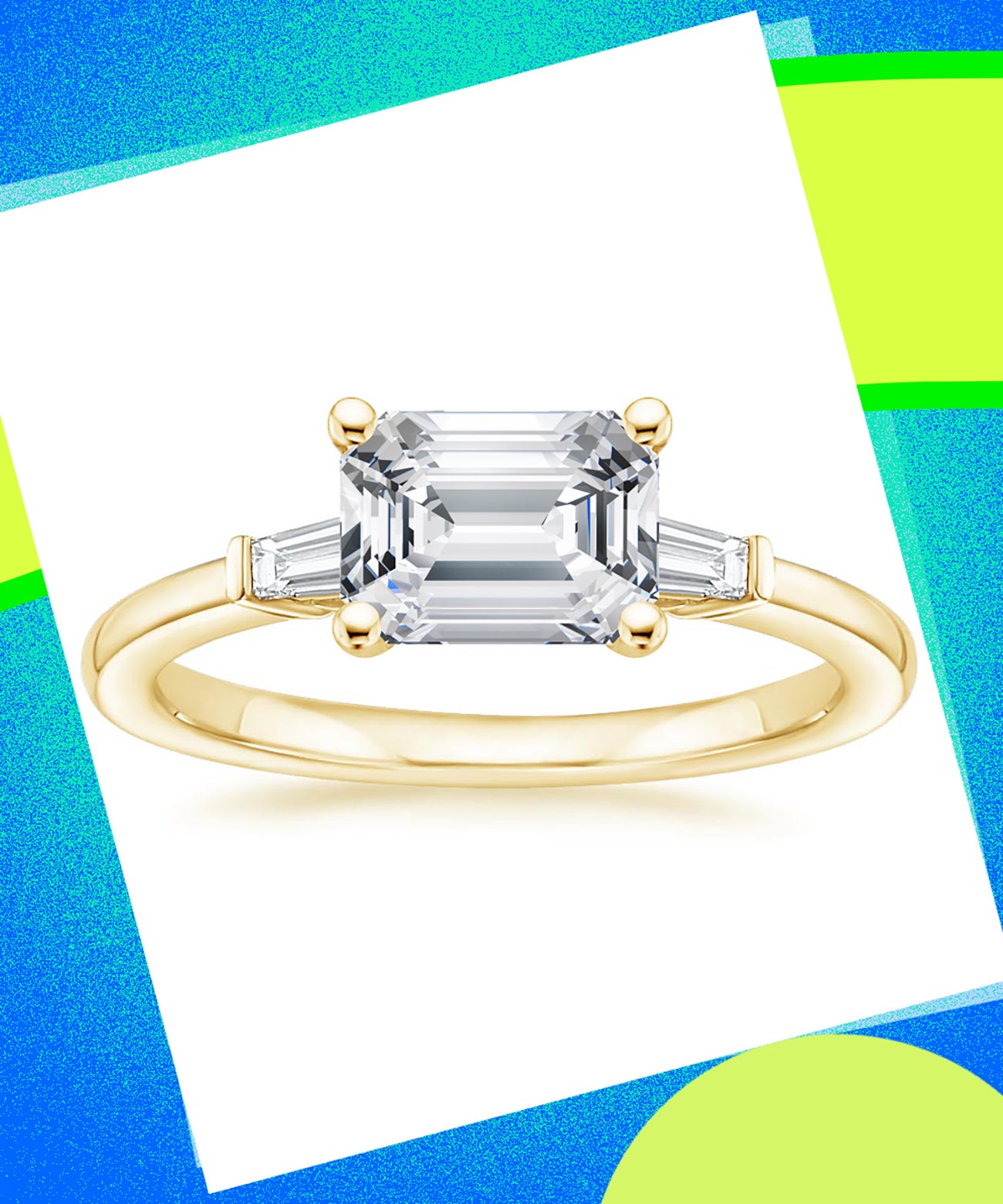 For brides with pared-back style, Sassone says to watch out for step-cut diamonds — a square or rectangle stone with parallel facets on all four sides, resembling steps — as a trend in 2023. “I love a step-cut diamond for a minimalist,” she says. “The clean architectural lines are perfect for someone with style but who doesn’t want a lot of flash.”
