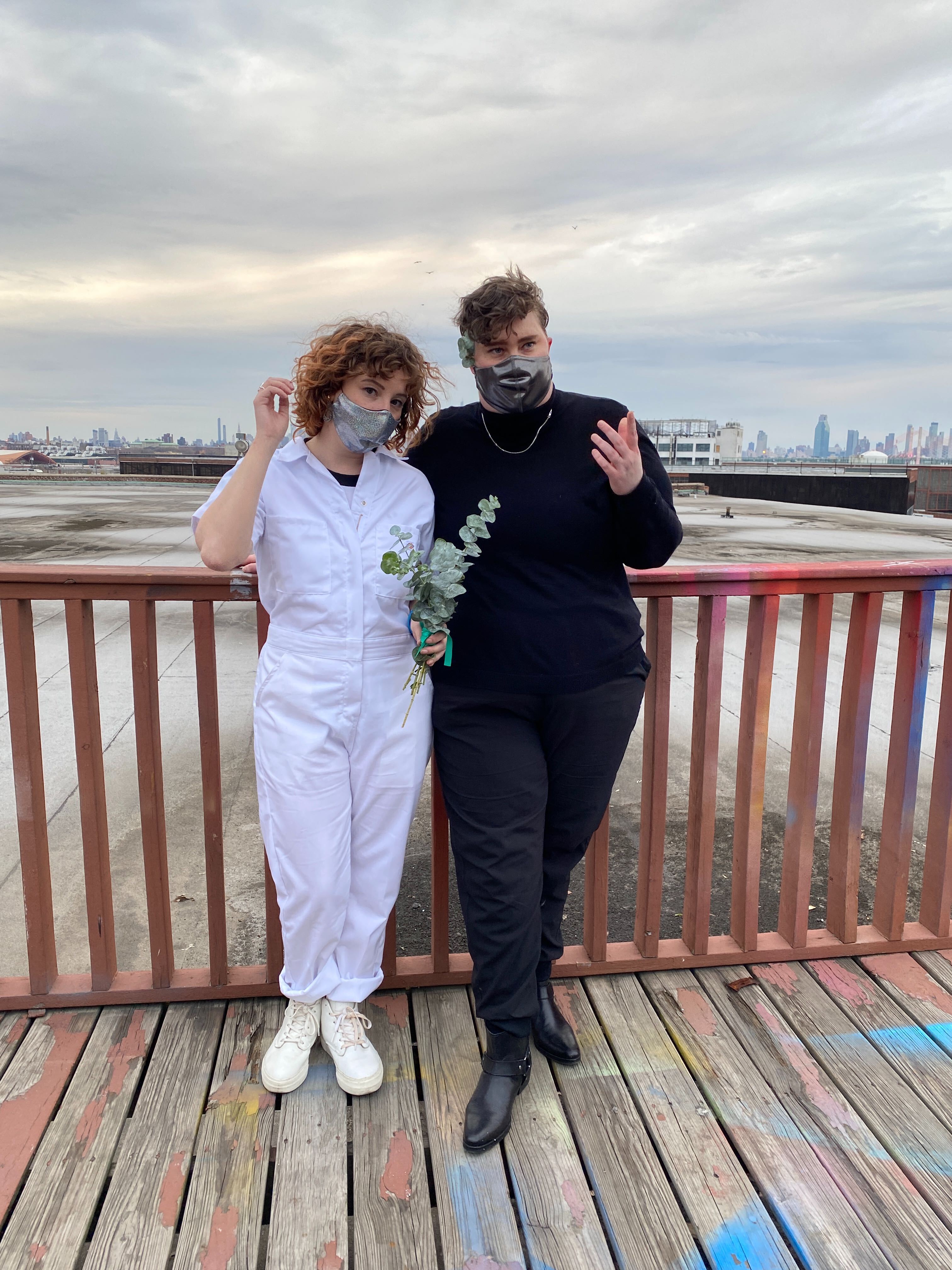 “My husband Scott and I were supposed to get married in Montalcino, Italy, in a beautiful castle in April. I know. So, the plan was always to legally get married at City Hall in Manhattan first a few weeks before. Little did we know that the civil ceremony would become our actual wedding. I originally ordered a simple silk Olivia Von Halle slip dress online, because who doesn’t want to wear silk in Tuscany? Once our wedding had to be canceled, though, we decided to just have our parents with us in the city. It felt so odd to get dressed up with everything going on, so we opted for something more simple. We racked our brains — and closets — and found two utility jumpsuits we both had, in white and navy. It must have been destiny, so we went with it. We took photos with our friend in his studio at the Brooklyn Navy Yards and made the most of a weird year. I truly couldn’t be happier.”Photo: Thi Lam.