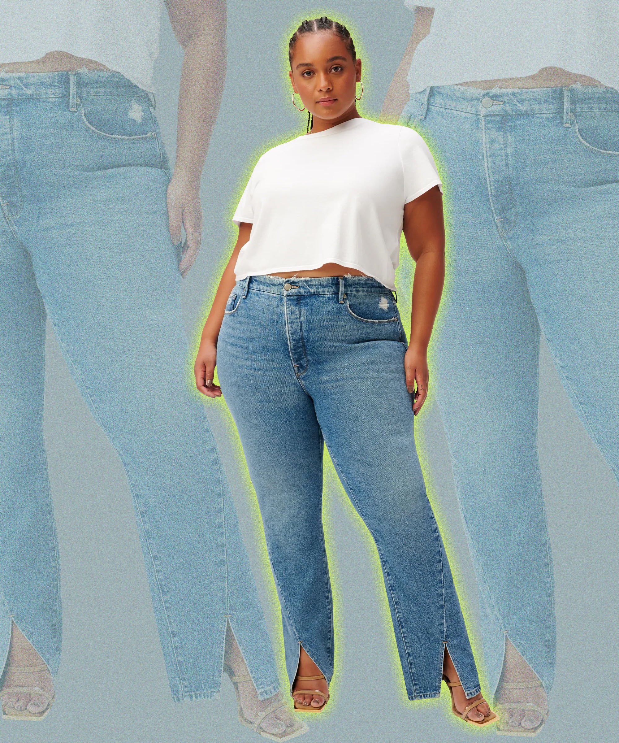 For a trendy twist to your good ol’ high-waisted fit, consider this Good American option featuring of-the-minute slit-front hems.