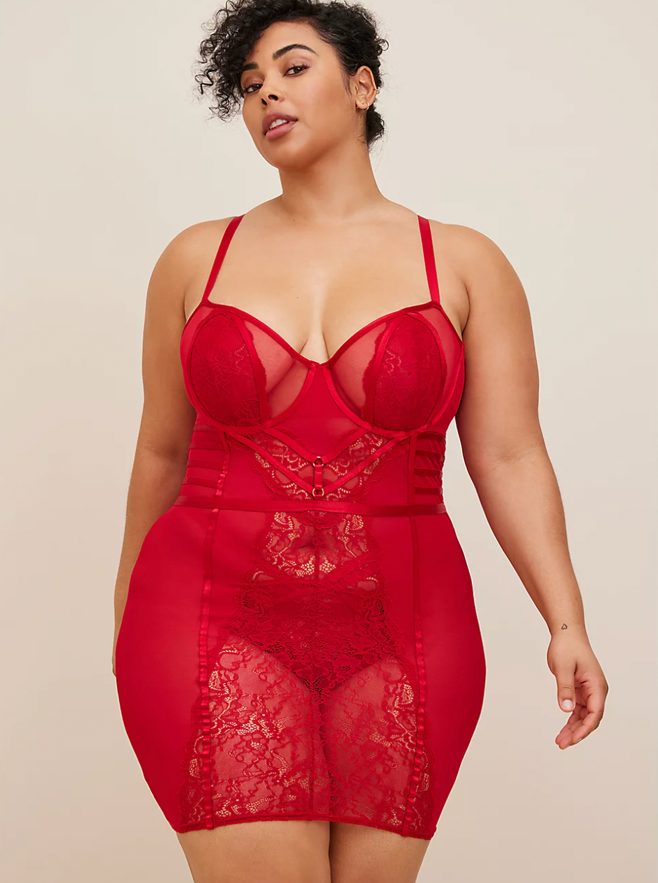 This stunning piece from Torrid combine strappy detailing, open cups, and lace to make a super-sexy chemise worthy of your most intimate occasions. Wear this in a matching panty (or not), and prepare to watch jaws drop at just how hot you look. In addition to the fiery red, it also comes in black.