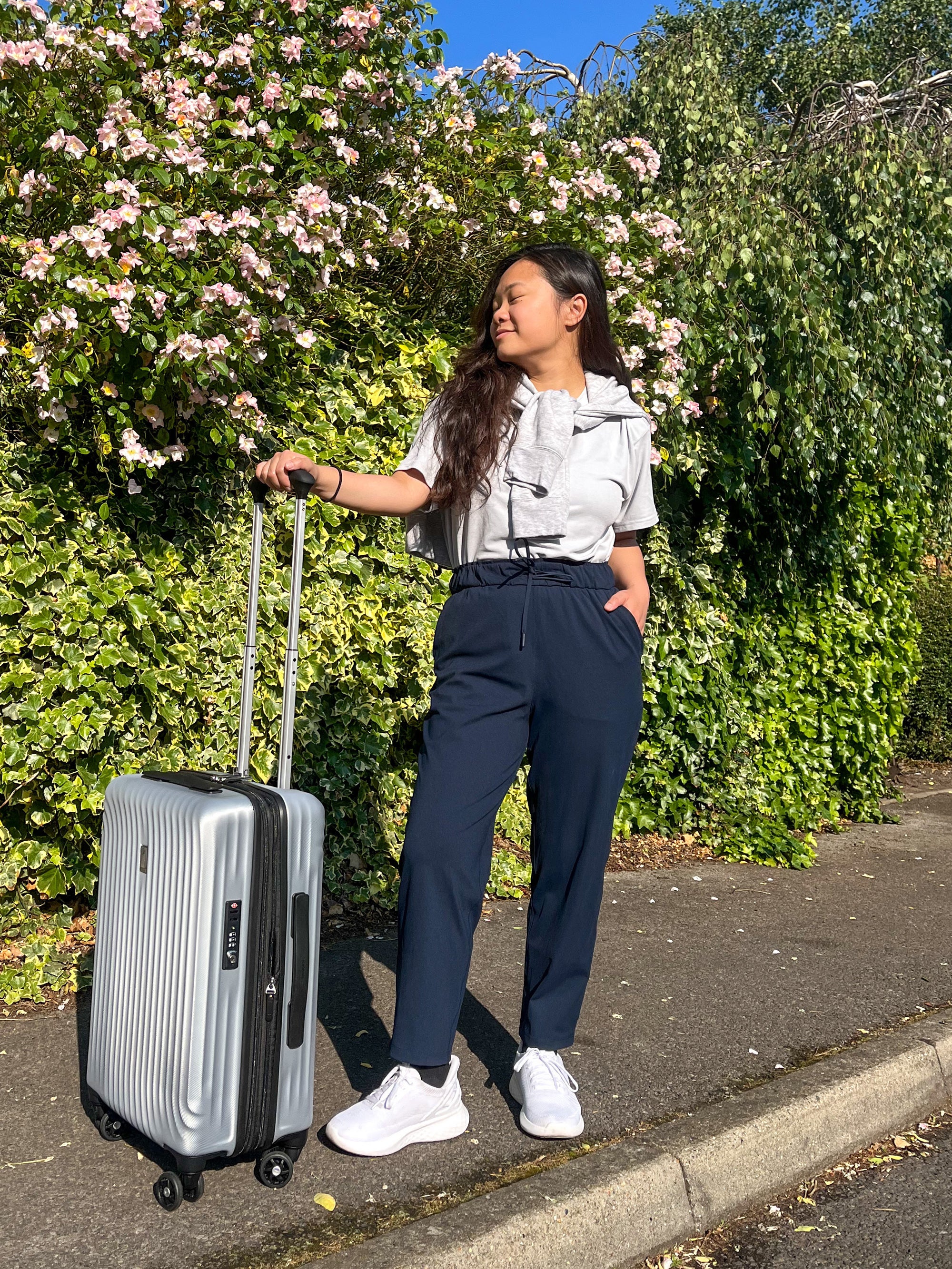 “When it starts getting chilly on the plane after takeoff, I like to cover up with Quince’s SuperSoft Fleece Crew ($34.90). Believe me when I say that this is the coziest sweatshirt ever. The fleece lining is almost cuddlier than my favorite childhood blanket. I don’t like wearing leggings, so Lululemon’s Stretch High-Rise Cropped Pant ($98) is the travel pant I constantly reach for when I want to feel comfy and look polished. The Luxtreme fabric is great at wicking away moisture (including any accidental drinks spillage), and I love that the elastic waistband is padded with soft fabric.