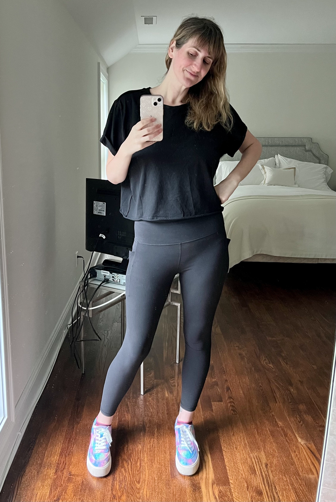 “I’ve found that if I wear all black and give a pop of color to the shoes, I still look polished enough to be seen out and about, but the clothes are perfectly comfortable. These Athleta leggings are a godsend. Not only do they have pockets (essential during travel!), but they are so soft and don’t feel like I’m being squished into a sausage casing. The cropped tee HP from Target is an affordable staple in my closet. It’s perfectly oversized and not too cropped, so I don’t have to worry about flashing anyone. Finishing it off with a comfy sneaker in a fun color (unfortunately, my fave sneakers are no longer avail but Keds makes a super similar one that are equally cute and comfortable), is the perfect way to balance out all the black. And, it’s easily layered with a sweatshirt, sweater, or jean jacket for those who get cold on the plane.”