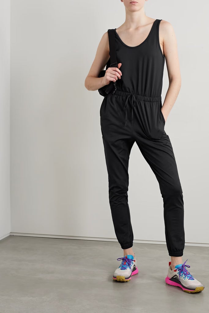 “There was a time when air travel was a veritable occasion — one that people got dressed up for in top hats and three-piece suiting. While I’m not totally saying we need to go back to that, I’m all for elevated comfort — and IMHO, I think this ensemble nails it. I love this lightweight, breathable Stretch Recycled-Jersey Jumpsuit ($100) from Girlfriend Collective because it’s a one-and-done instant outfit, and because I get cold on planes, I pair it with my trusty Levi’s Original Trucker Jacket ($79.99). Lastly, a pair of cool, comfortable sneakers to support your feet during your journey. (I swear by my ON Cloudmonsters ($169.95), which are also great for when you need to book it to your gate before the final boarding call.)”