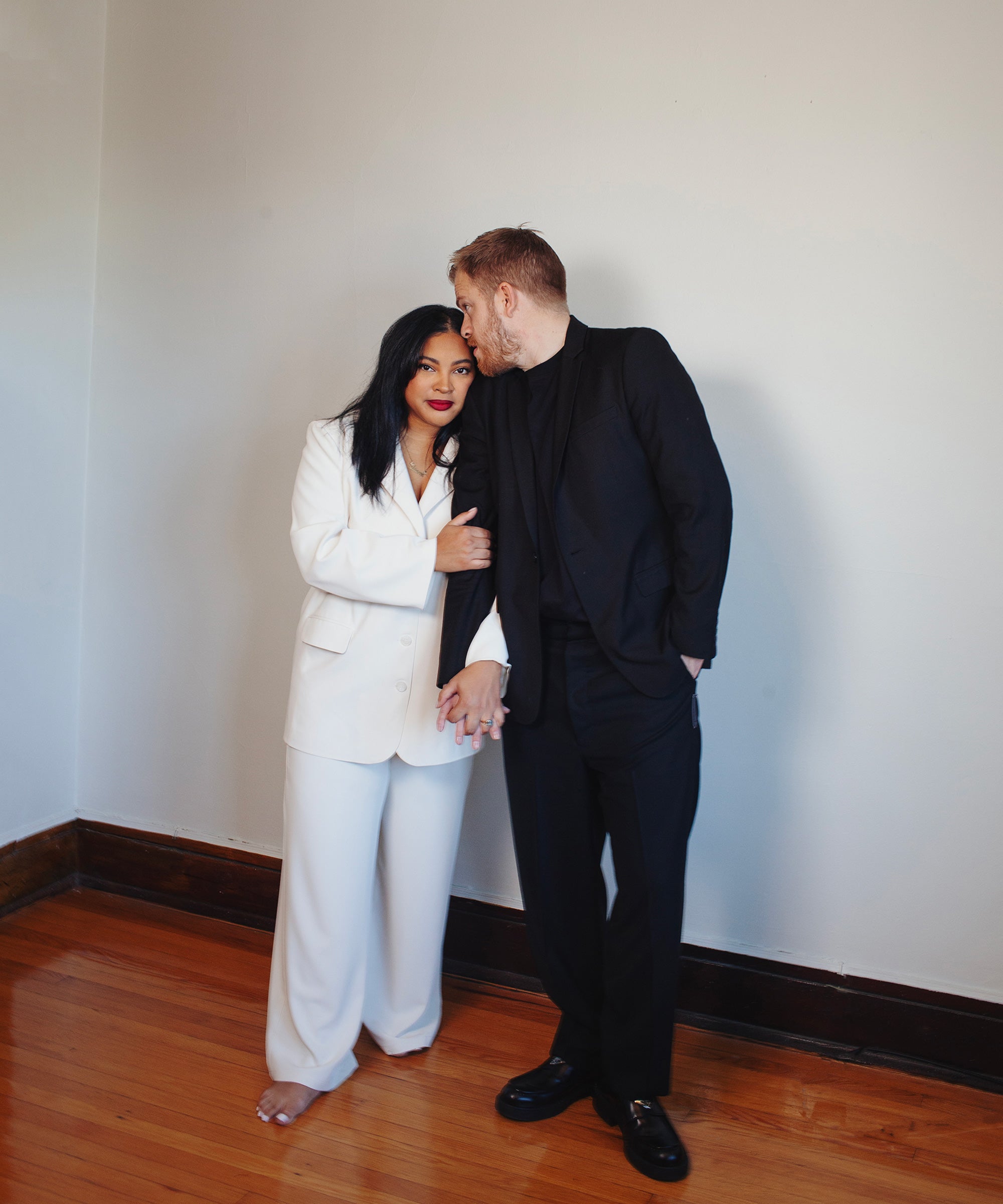 While they didn’t do it in pursuit of views, Betancourt and her fiancé wanted their outfits to be a tease of what guests could expect from their wedding, as well as reflect them as creatives. They opted for a more laid-back feel to the photos — which were taken in an empty room with white walls and wood molding — and a white suit and nameplate necklace for Betancourt and a black suit with a matching T-shirt for her fiancé. For those looking closely, there was one Easter egg that hinted at the vibe of their wedding: Betancourt chose to go barefoot in the photos. “We want [the wedding]to be elevated and elegant and you know a little bit glamorous,” she says. “[But] at the end of the day, we’re gonna get really drunk and have a good time in New Orleans.”