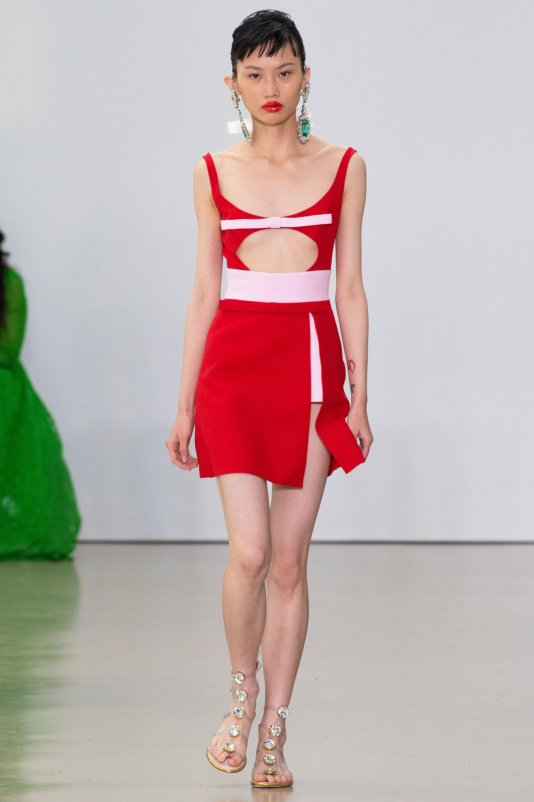 Take, for example, the Giambattista Valli spring 2022 lineup, which included a white feather dress featuring pink and red embellishments, paired with crimson sunglasses. Then, there was Portuguese brand Marques’ Almeida, which showed a brighter version of the color combo, in the form of a poplin, asymmetrical pink dress with an attached crossbody red sleeve, as well as a pink slip dress with a scarlet button-down shirt underneath.