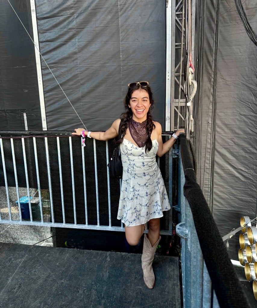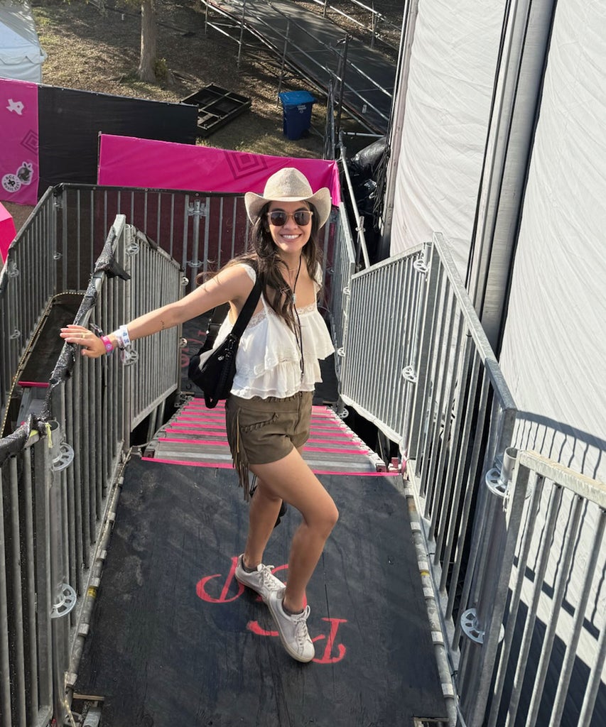 For day two, I decided to go for an off-duty cowgirl look featuring a romantic lace tank and faux suede fringe micro shorts, both from Free People. (This is not an #ad, I just genuinely love the brand!) I recently found the cutest cowboy hat ever at Anthropologie — it works as a neutral but has teeny-tiny sequins sewn throughout for a hint of sparkle. It was a total compliment magnet, and also helped keep me cool during a day of truly incredible sets seen from the T-Mobile stage. (Also keeping me cool: The AC, fans, and drink stations at Club Magenta — in the club, we’re all fam!)