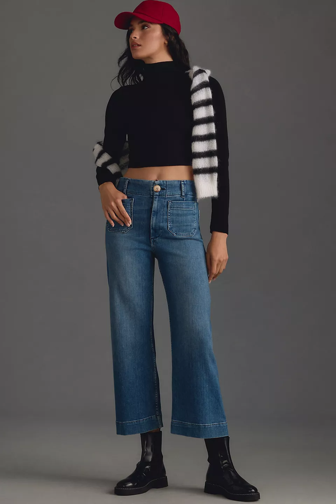 If you are looking for non-traditional, petite-friendly jeans, Anthropologie has quite a selection. The brand stocks plenty of fashion-forward styles like wide-leg paper-bag denim, dramatic boot cuts, and colorful cropped jeans. You can find plenty of standard options as well from house brands like Pilcro and beloved denim labels like Joe’s Jeans and Good American.
