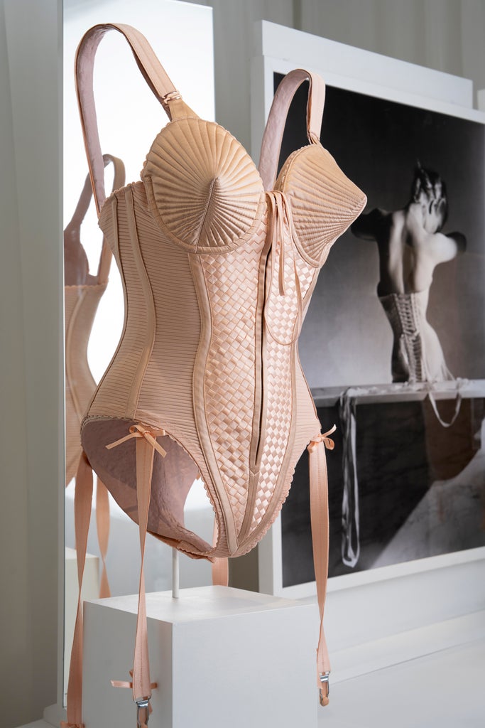 In the same room, Gaultier‘s first employer Cardin — whom Gaultier says he learned “freedom” from — gets a mention with a dress, made from synthetic “Cardine” fiber that could be molded at a high temperature, worn by Lauren Bacall. It’s fitting not only because Cardin taught Gaultier to experiment and “to show fashion like a play, like a theater, even if it was showing something that has to be a reality,” but because, in a full-circle moment, the exhibition is housed in a former property of Cardin, who resided in Lacoste.