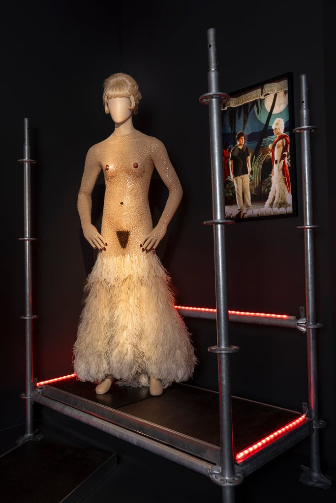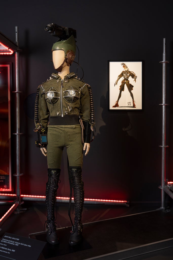 The exhibition, which is a smaller version of the show that debuted at the Cinémathèque française in Paris in 2021, continues with a look at Gaultier’s cinematic oeuvre, with his costume sketches for films like The Cook, The Thief, His Wife & Her Lover; The City of Lost Children; and the aforementioned The Fifth Element. (The latter includes a costume he designed for Prince who was supposed to star in the apocalyptic sci-fi film.) There are also some of the more fantastical costumes from the films he worked on, including a military-style khaki garment with motorcycle headlights over the breasts worn by Victoria Abril in Kika and the embroidered gown featuring a pearl design in the shape of pubic hair worn by Gael García Bernal in Bad Education, an evolution of a look Gaultier showed years prior on the runway on Naomi Campbell.