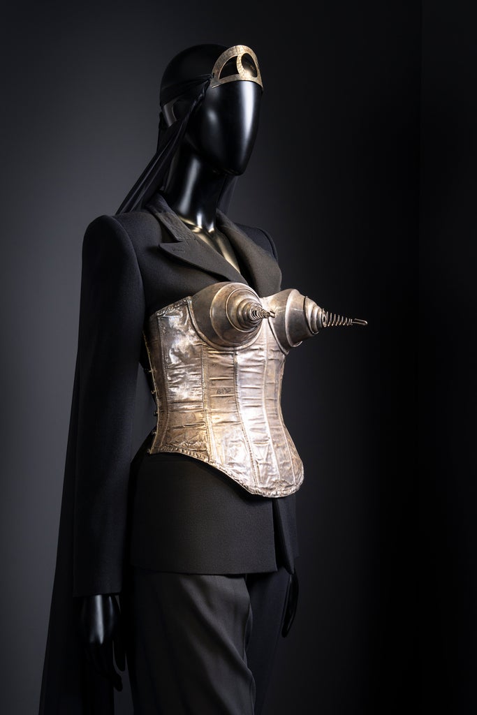 Alongside a video clip and costumes from the film, as well as photographers showing Space Age designs of Rabanne and André Courrèges, are futuristic pieces from Gaultier, including a metal cone corset and a breastplate look, inspired by Federico Fellini’s Satyricon and from the designer’s 2020 show that both celebrated his 50-year career and marked his final collection. (The brand now operates on a guest-designer model, with rotating creatives presenting under the Jean Paul Gaultier name.)