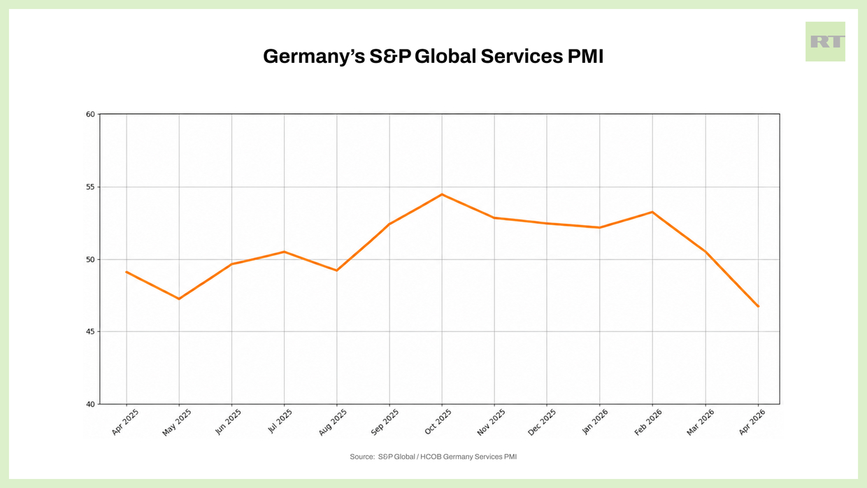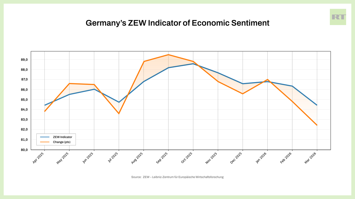 Now, however, whatever fragile recovery had taken root, fiscally driven or otherwise, is being wiped away in light of the war against Iran and subsequent slow-burning economic mayhem it has produced. A number of indicators in Germany are flashing at multi-year lows. RT offers a snapshot in four charts of the dark clouds once again gathering over the EU’s largest economy.