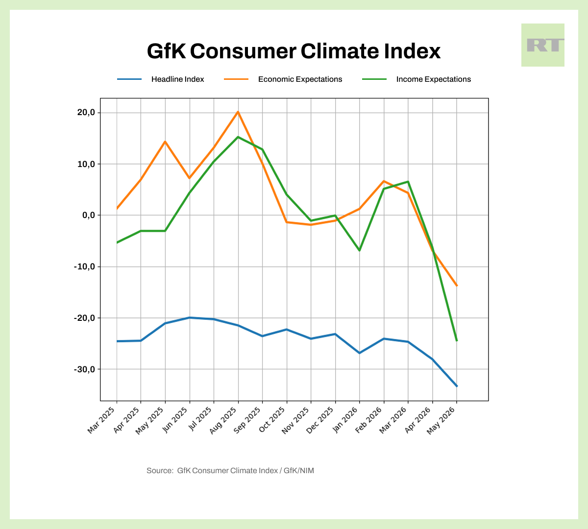 German consumers are suddenly much less sanguine about where things are headed these days. The GfK Consumer Climate Index fell to -33.3 for May 2026, its lowest level in two years. The 5.2-point drop from April is the steepest monthly decline since the crisis year of 2022, driven by rising energy prices and geopolitical uncertainty.
