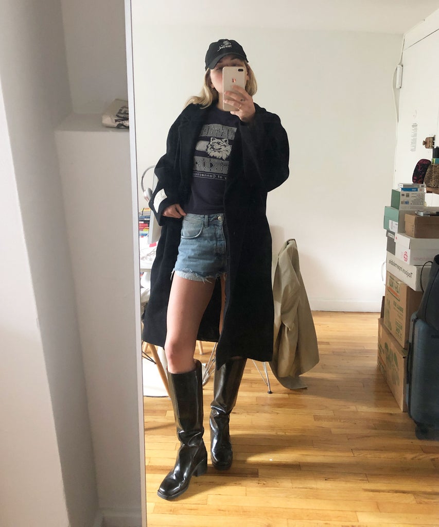 That’s how I found myself in the “laundry day” outfit, famously worn by Lorelai on Rory’s first day at Chilton (Season 1, Episode 2). I wasn’t intentionally copying her look; instead, after a day of work, I looked in the mirror and noticed how uncanny the sartorial resemblance was. My version included a slightly too small Connecticut Huskies T-shirt with jean shorts, and black, knee-high boots. After observing the likeness to Lorelai’s iteration — her shirt was pink tie-dye and she wore it with a long, black coat — I slipped on a coat of my own, for good measure. Wondering if the look was recognizable to anyone else, I posted it on Instagram stories, asking my followers if it looked familiar. To my surprise, at least a dozen people responded — some even calling out the exact episode she wore it in.